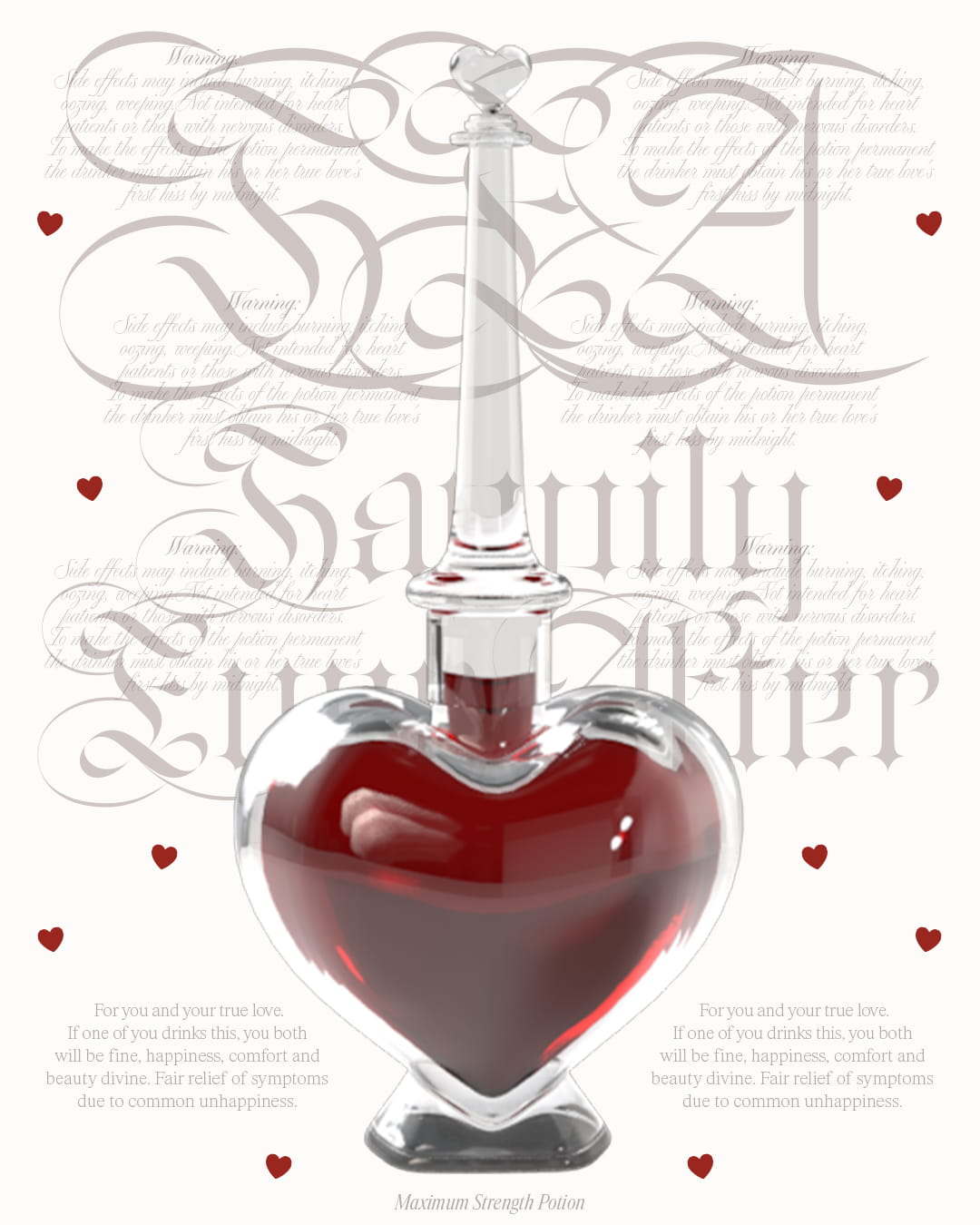 I focused on the type treatment while she modeled a custom 3D bottle from scratch, based on my direction and vision. The concept is a semi-gothic take on the iconic 'Love Potion' from the Fairy Godmother’s in Shrek 2.