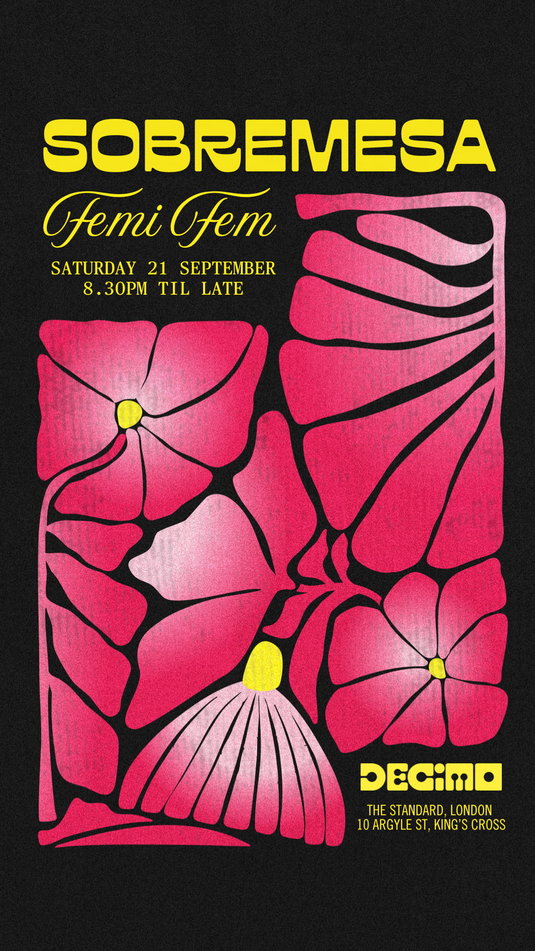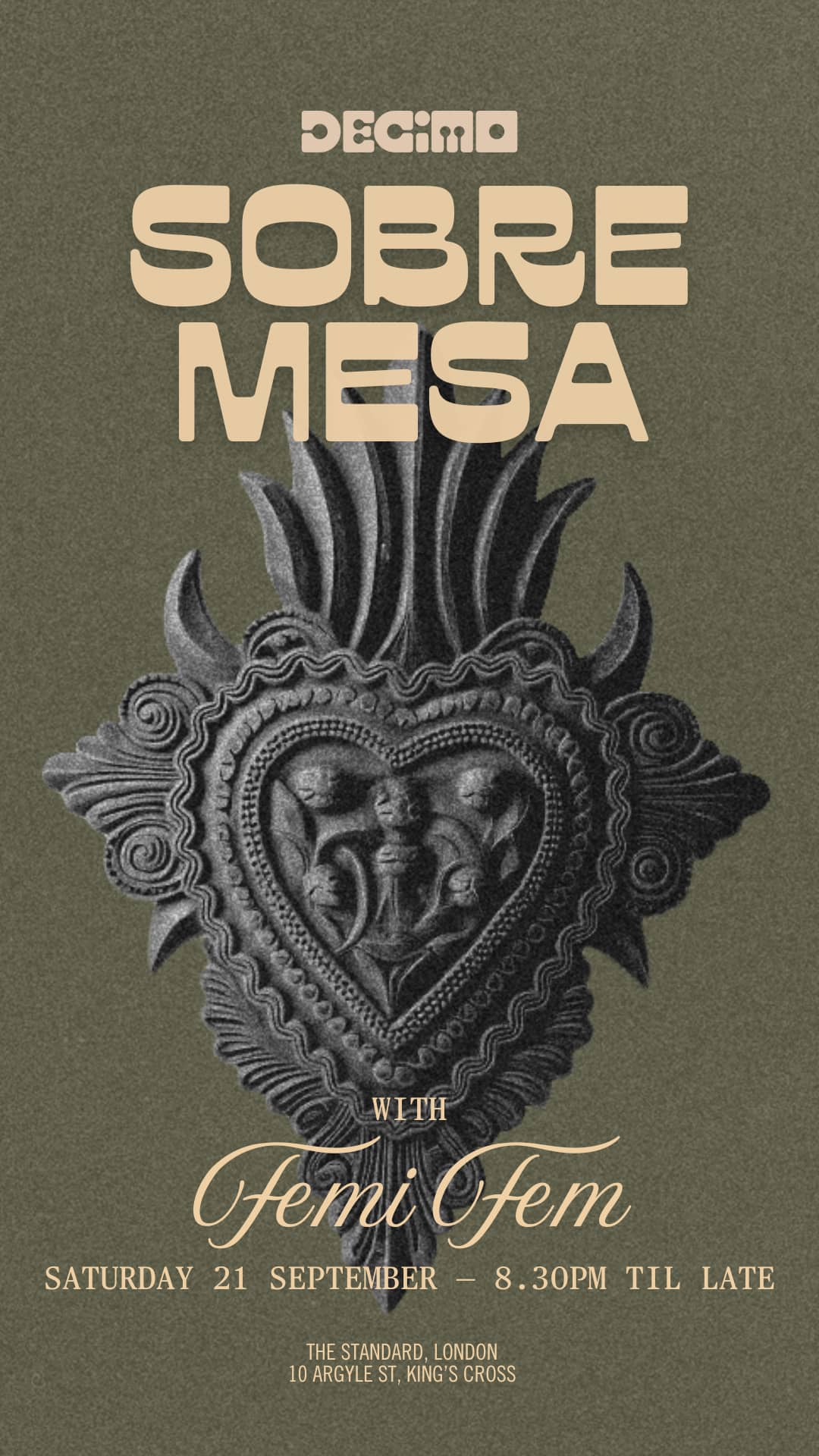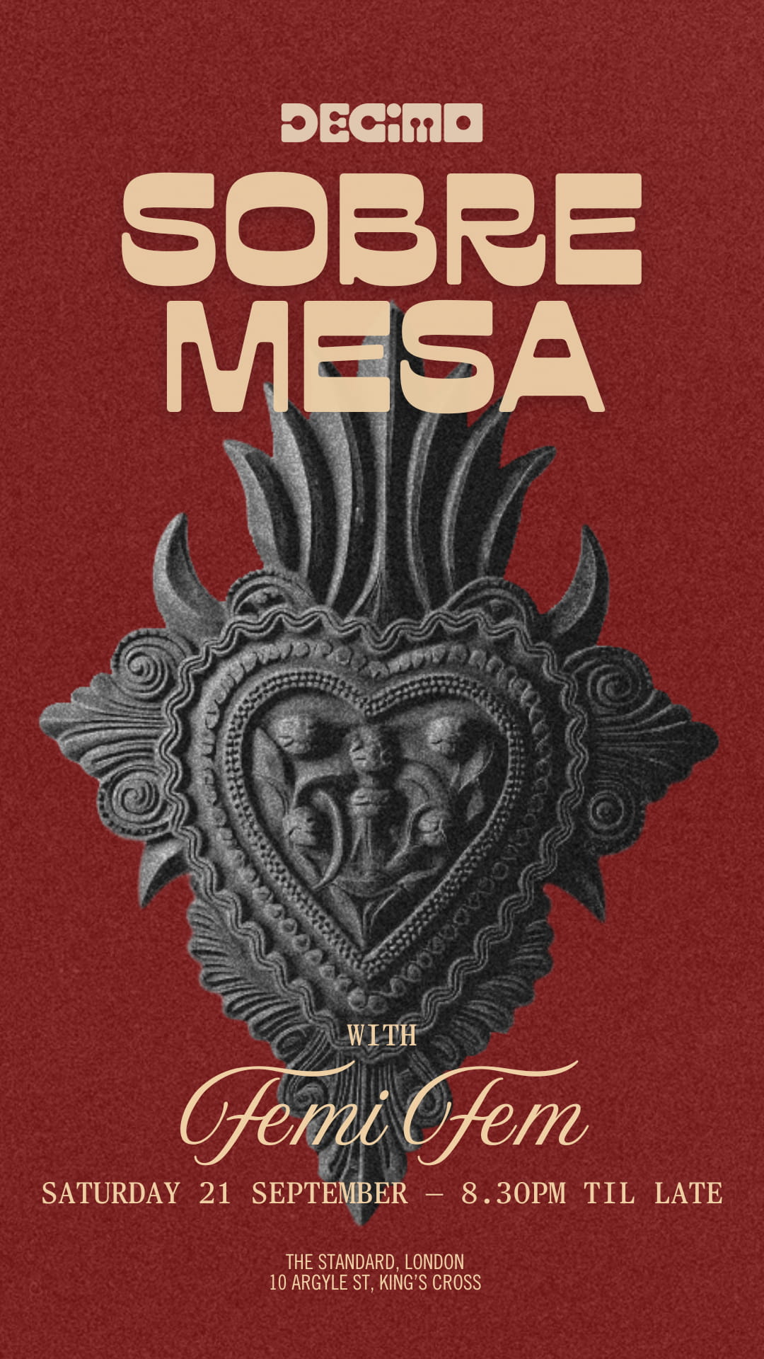 DECIMO at The Standard, London hosts a weekly event called Sobremesa—a vibrant evening of themed dinners and DJ sets. This series of promotional flyers was designed to encourage reservations and capture the energy of the night. The visual and typographic direction draws from Mexican culture, echoing Décimo’s culinary roots under Michelin-starred Chef Peter Sanchez-Iglesias. At the heart of each poster is a reinterpretation of the 'rock heart'—a symbolic fusion of two iconic elements: el mortero (the traditional stone mortar) and the Sagrado Corazón. Together, they embody heritage, spirituality, and the deep cultural connection to food.