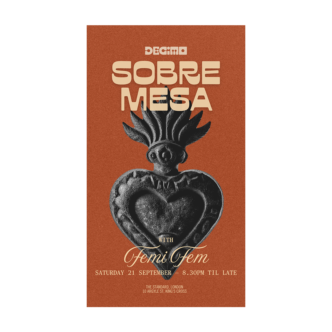 DECIMO at The Standard, London hosts a weekly event called Sobremesa—a vibrant evening of themed dinners and DJ sets. This series of promotional flyers was designed to encourage reservations and capture the energy of the night. The visual and typographic direction draws from Mexican culture, echoing Décimo’s culinary roots under Michelin-starred Chef Peter Sanchez-Iglesias. At the heart of each poster is a reinterpretation of the 'rock heart'—a symbolic fusion of two iconic elements: el mortero (the traditional stone mortar) and the Sagrado Corazón. Together, they embody heritage, spirituality, and the deep cultural connection to food.